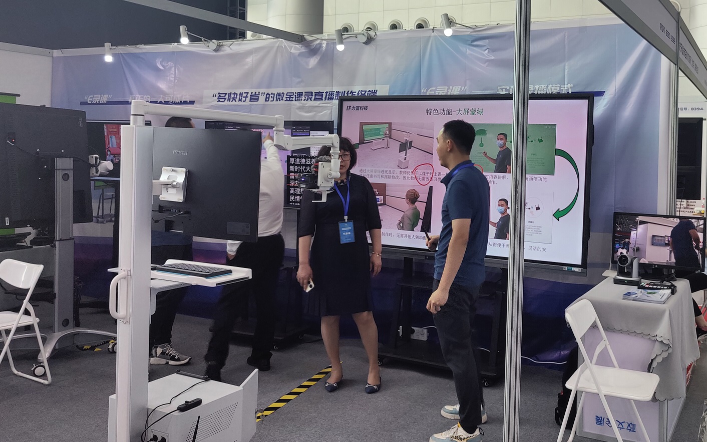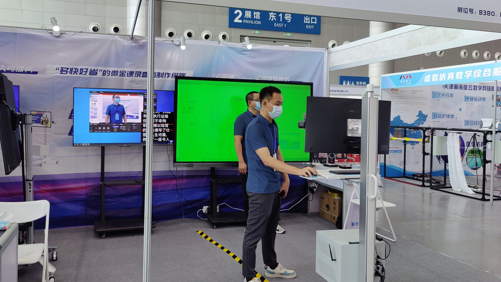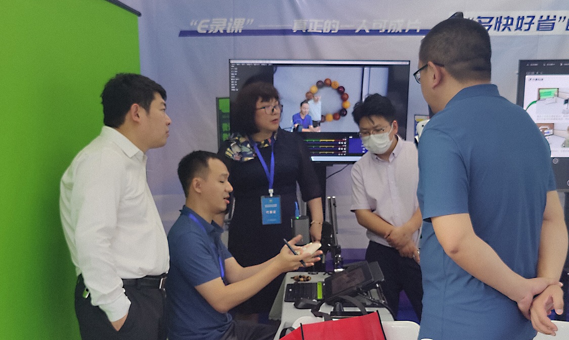 展览会第一天便吸引了众多老师和相关从业者前来参观。向各位来宾介绍了绿幕抠像、虚拟直播间在教学直播和微课、金课制作中的应用,并展示了“E录课”通过绿幕抠像的方式构造出虚实结合的精美课堂,只需通过简单的操作便可轻松使用复杂的录播设备制作精品课,让先进数字媒体技术融入教学活动。