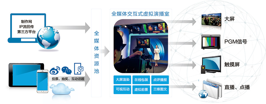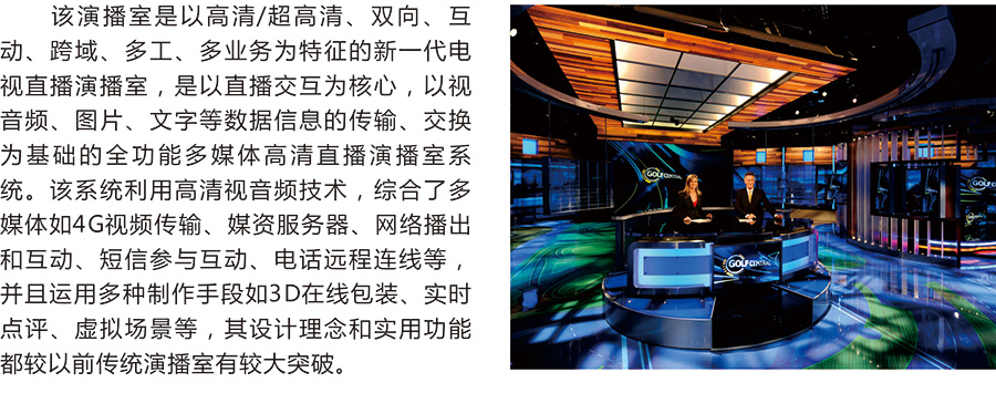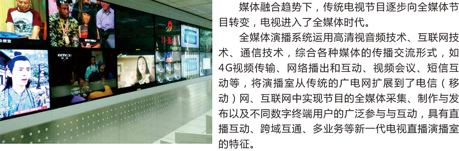 媒体融合趋势下,传统电视节目逐步向全媒体节目转变,电视进入了全媒体时代。全媒体演播系统运用高清视音频技术、互联网技术、通信技术,综合各种媒体的传播交流形式,如4G视频传输、网络播出和互动、视频会议、短信互动等,将演播室从传统的广电网扩展到了电信(移动)网、互联网中实现节目的全媒体采集、制作与发布以及不同数字终端用户的广泛参与与互动,具有直播互动、跨域互通、多业务等新一代电视直播演播室的特征