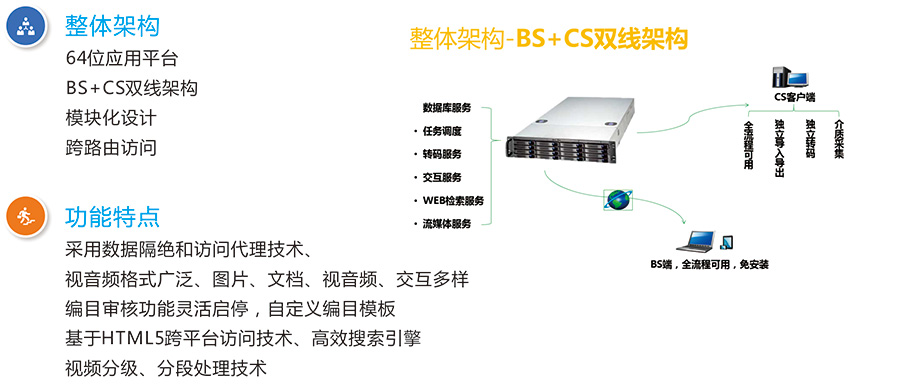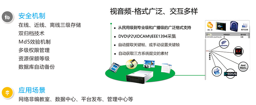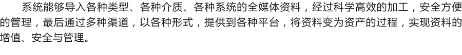 系统能够导入各种类型、各种介质、各种系统的全媒体资料,经过科学高效的加工,安全方便的管理,最后通过多种渠道,以各种形式,提供到各种平台,将资料变为资产的过程,实现资料的增值、安全与管理