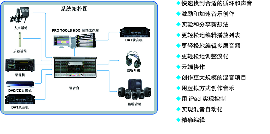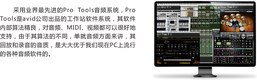 采用业界最先进的Pro Tools音频系统,ProTools是avid公司出品的工作站软件系统,其软件内部算法精良,对音频、MIDI、视频都可以很好地支持,由于其算法的不同,单就音频方面来讲,其回放和录音的音质,是大大优于我们现在PC上流行的各种音频软件的