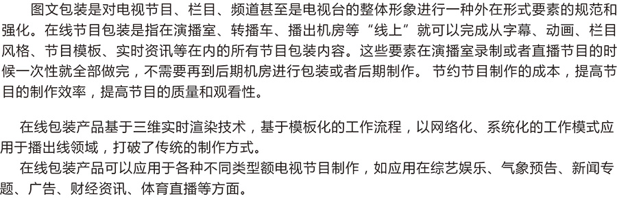 图文包装是对电视节目、栏目、频道甚至是电视台的整体形象进行一种外在形式要素的规范和强化。在线节目包装是指在演播室、转播车、播出机房等“线上”就可以完成从字幕、动画、栏目风格、节目模板、实时资讯等在内的所有节目包装内容。这些要素在演播室录制或者直播节目的时候一次性就全部做完,不需要再到后期机房进行包装或者后期制作。节约节目制作的成本,提高节目的制作效率,提高节目的质量和观看性。