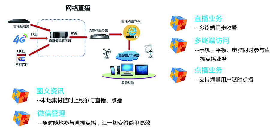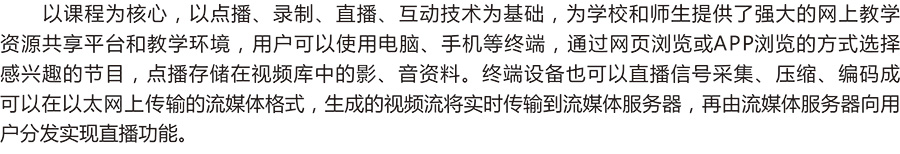 以课程为核心,以点播、录制、直播、互动技术为基础,为学校和师生提供了强大的网上教学资源共享平台和教学环境,用户可以使用电脑、手机等终端,通过网页浏览或APP浏览的方式选择感兴趣的节目,点播存储在视频库中的影、音资料。终端设备也可以直播信号采集、压缩、编码成可以在以太网上传输的流媒体格式,生成的视频流将实时传输到流媒体服务器,再由流媒体服务器向用宀分发实现直播功能