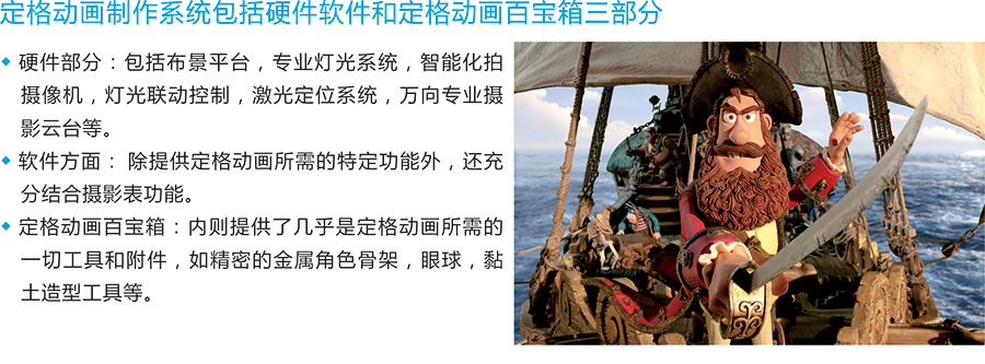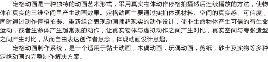 定格动画是一种独特的动画艺术形式,采用真实物体动作停格拍摄然后连续播放的方法,使物体在真实的三维空间里产生动画效果。定格动画主要通过实拍体现材料、空间的真实感、可信度,同时通过动作停格拍摄、重新组合表现动画师超现实的动作设计,使非生命物体产生可信的有生命运动,或者生命体产生超常规的动作,让真实物体与虚拟动作之间产生对比,真实空间与夸张造型之间产生对比,从而自由表达创作者意念,体现动画设计意趣。定格动画制作系统,是一个适用于黏土动画,木偶动画,玩偶动画,剪纸,砂土及实物等多种定格动画的完整制作解决方案。
