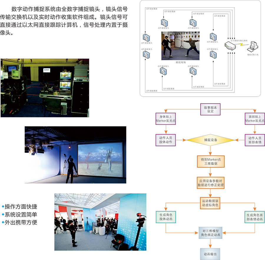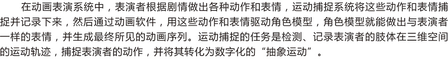 在动画表演系统中,表演者根据剧情做出各种动作和表情,运动捕捉系统将这些动作和表情捕捉并记录下来,然后通过动画软件,用这些动作和表情驱动角色模型,角色模型就能做出与表演者一样的表情,并生成最终所见的动画序列。运动捕捉的任务是检测、记录表演者的肢体在三维空间的运动轨迹,捕捉表演者的动作,并将其转化为数字化的“抽象运动”