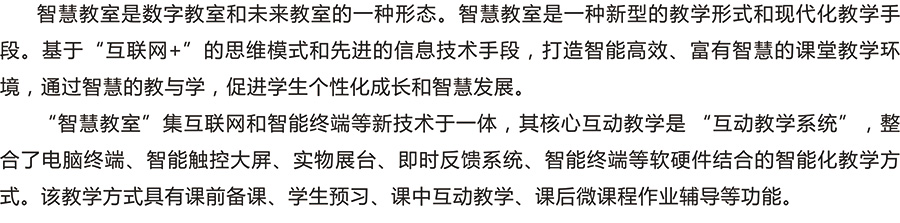 智慧教室是数字教室和未来教室的一种形态。智慧教室是一种新型的教学形式和现代化教学手段。基于“互联网+”的思维模式和先进的信息技术手段,打造智能高效、富有智慧的课堂教学环境,通过智慧的教与学,促进学生个性化成长和智慧发展